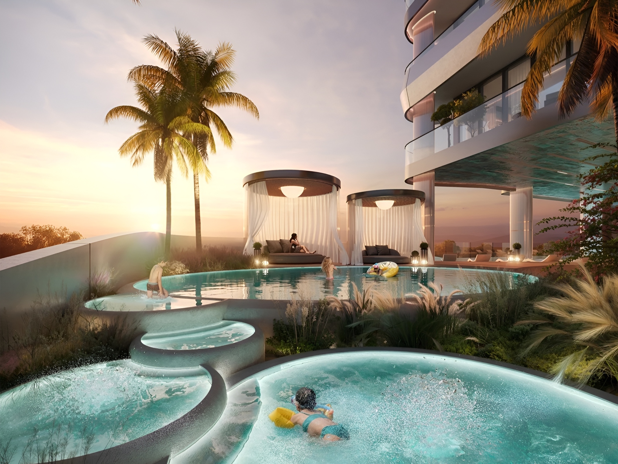 - Rooftop dining terraces, BBQ decks, Sky Party Deck with DJ stations, Creator Pods, and Vitaplay Arena