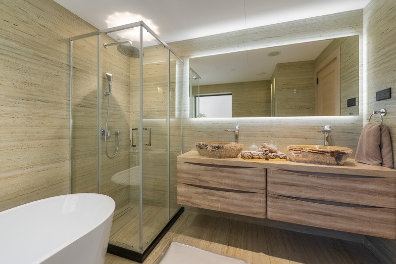 A defining feature of the property is its extensive use of high quality natural stone. From the floors to the bespoke bathroom finishes, the materials introduce warmth, texture, and quiet luxury throughout. The bathrooms are particularly striking, featuring sculptural stone basins and refined detailing that evoke the atmosphere of a private spa.