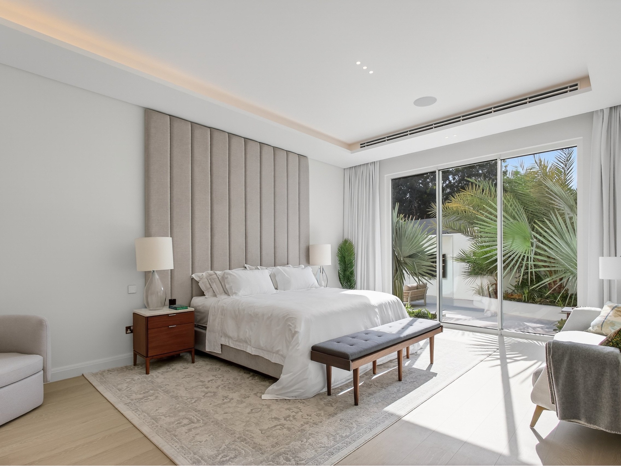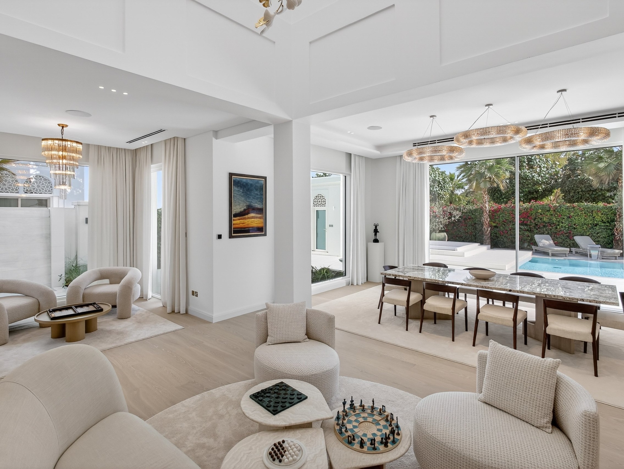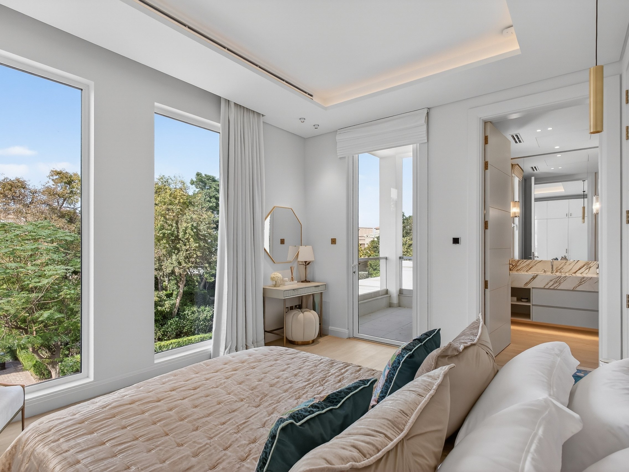 Arranged across 16,500 sq ft and three beautifully proportioned levels, the villa has been designed with balance and privacy in mind. Five generous principal en-suite bedrooms are thoughtfully distributed, allowing the house to feel expansive yet composed, with natural light and outlooks shaping each space.