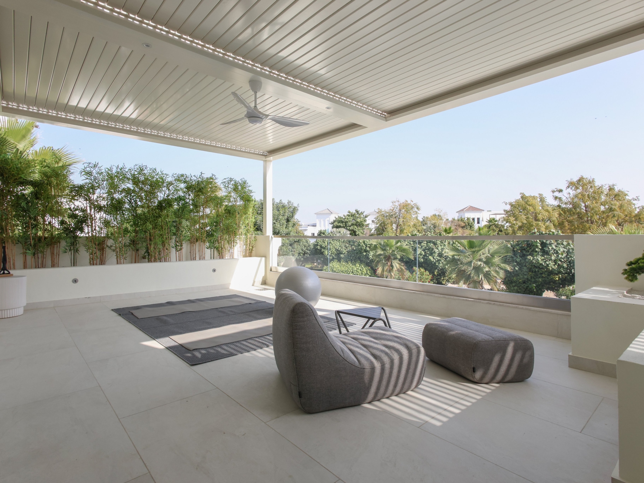 For moments when the day’s energy still lingers, the home reveals a collection of leisure spaces designed to be enjoyed at your own pace — from a private gym and entertainment lounge to staff accommodation and expansive outdoor living areas. A wellness balcony invites quieter moments, while the rooftop terrace sets the scene for evenings of celebration under the stars.