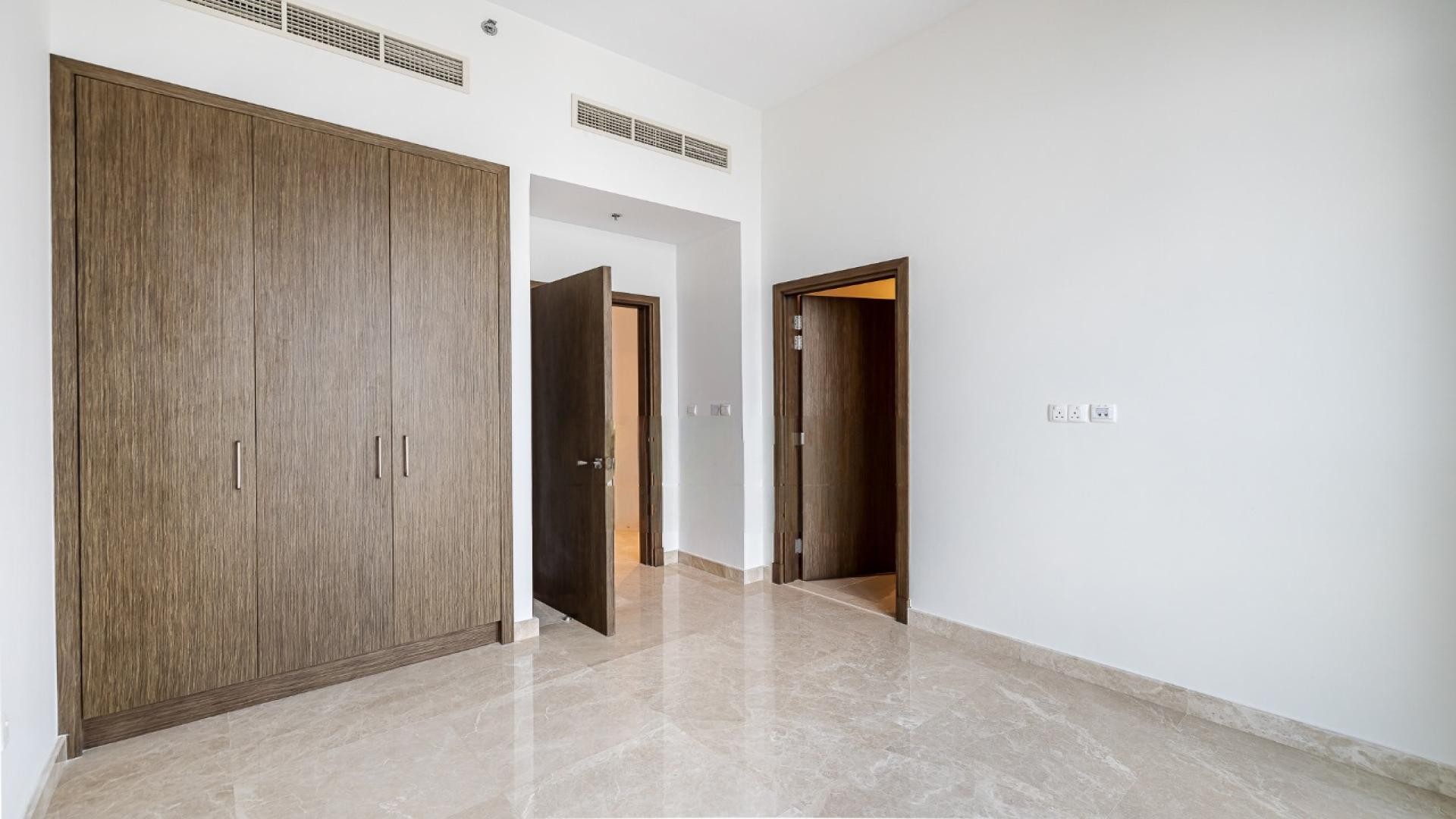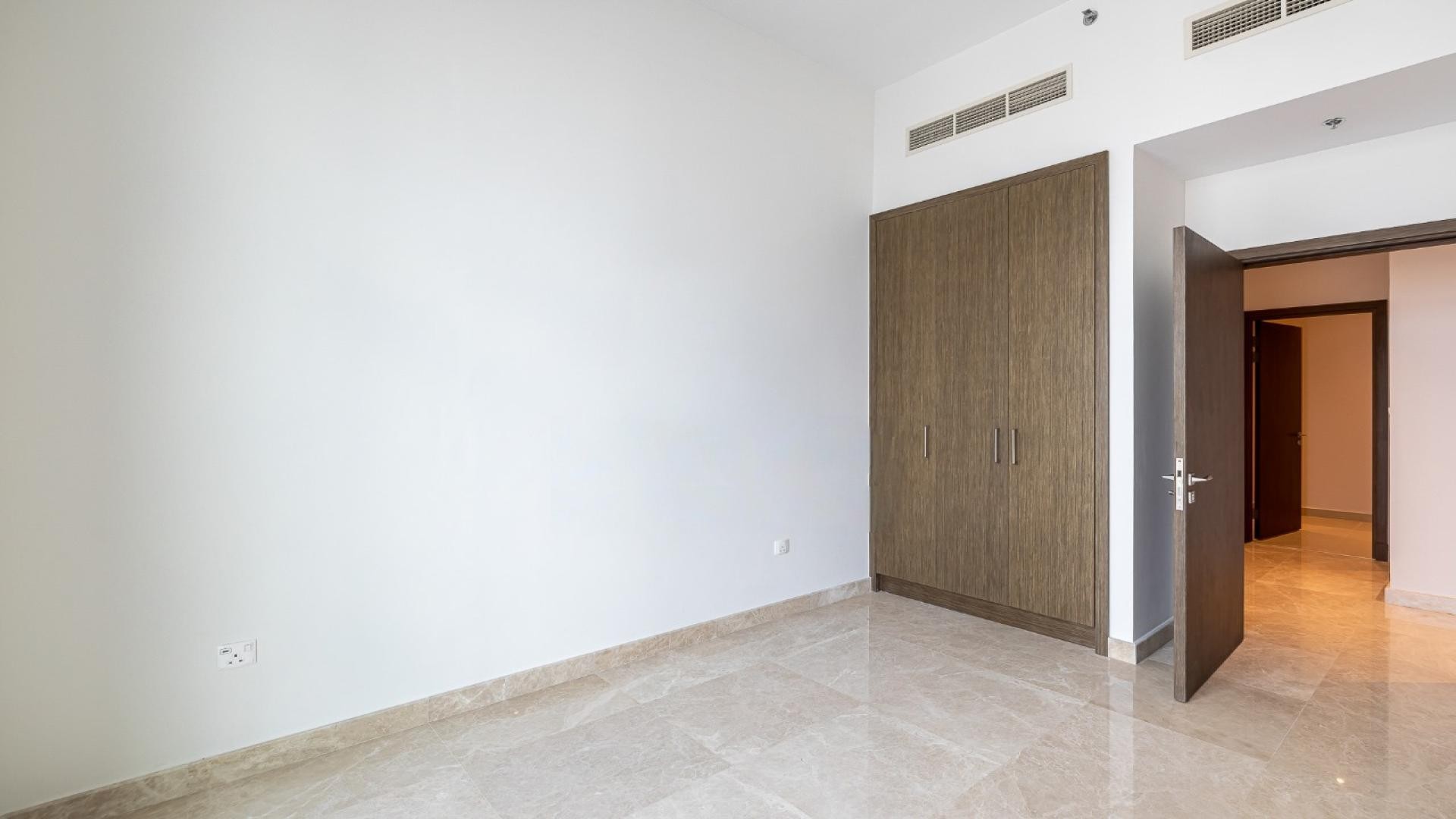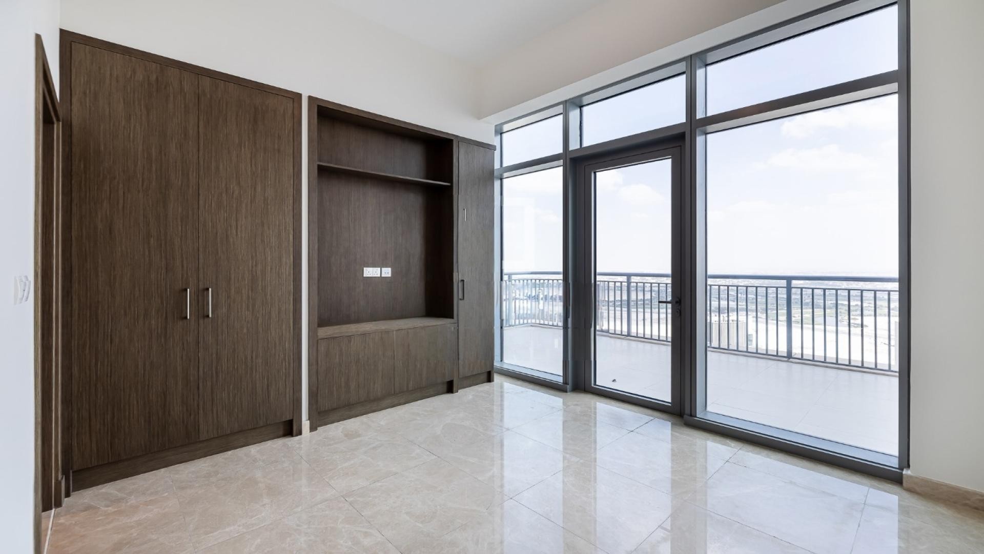 The apartment includes three en-suite bedrooms with built-in wardrobes, a maid’s room, and a fully fitted open kitchen designed for modern living. Bathrooms feature premium finishes, while the unfurnished interior provides a clean, contemporary canvas.