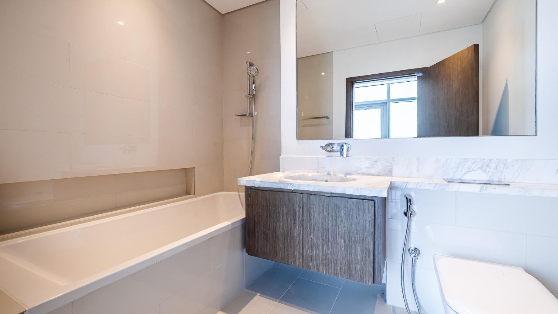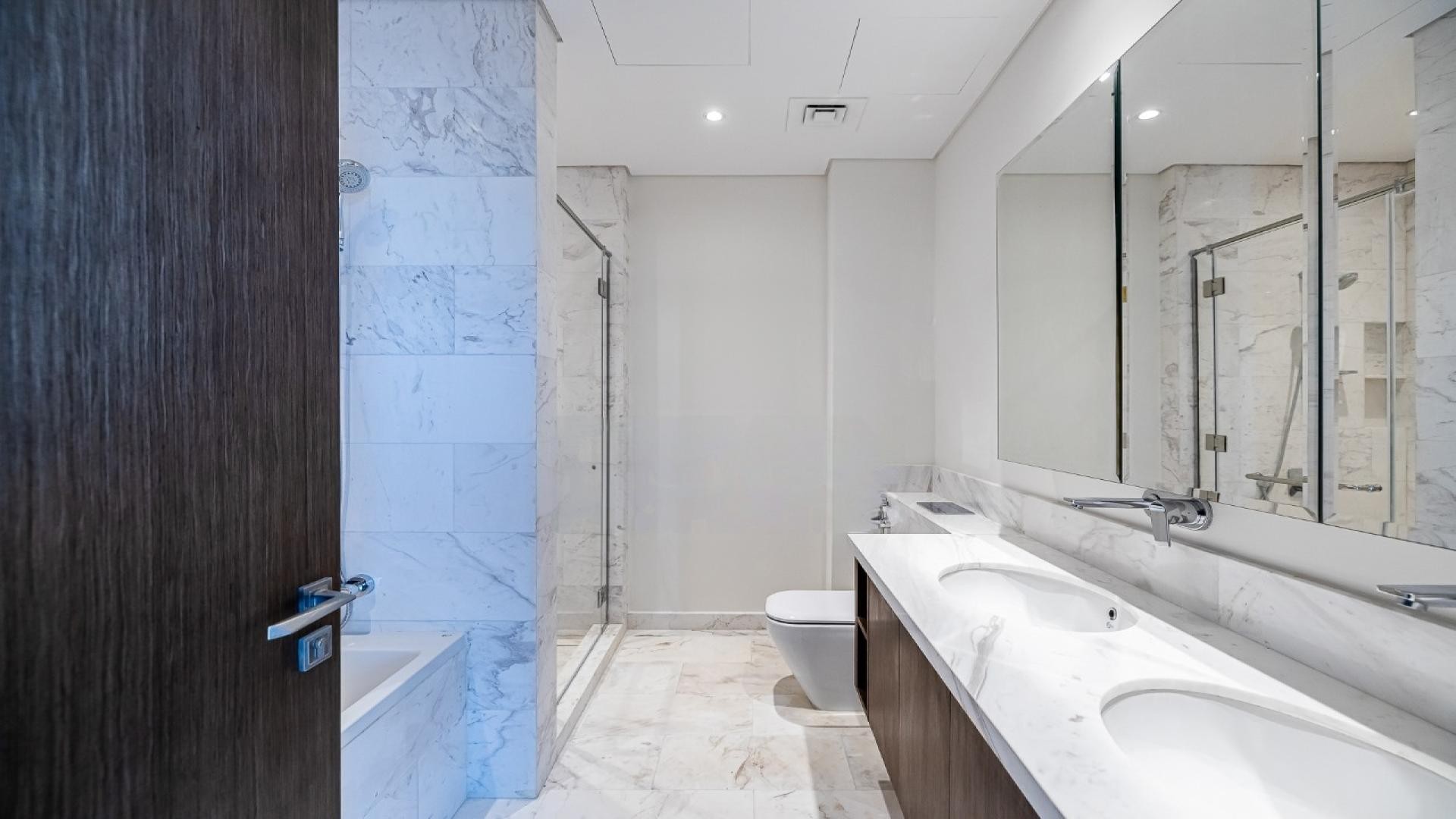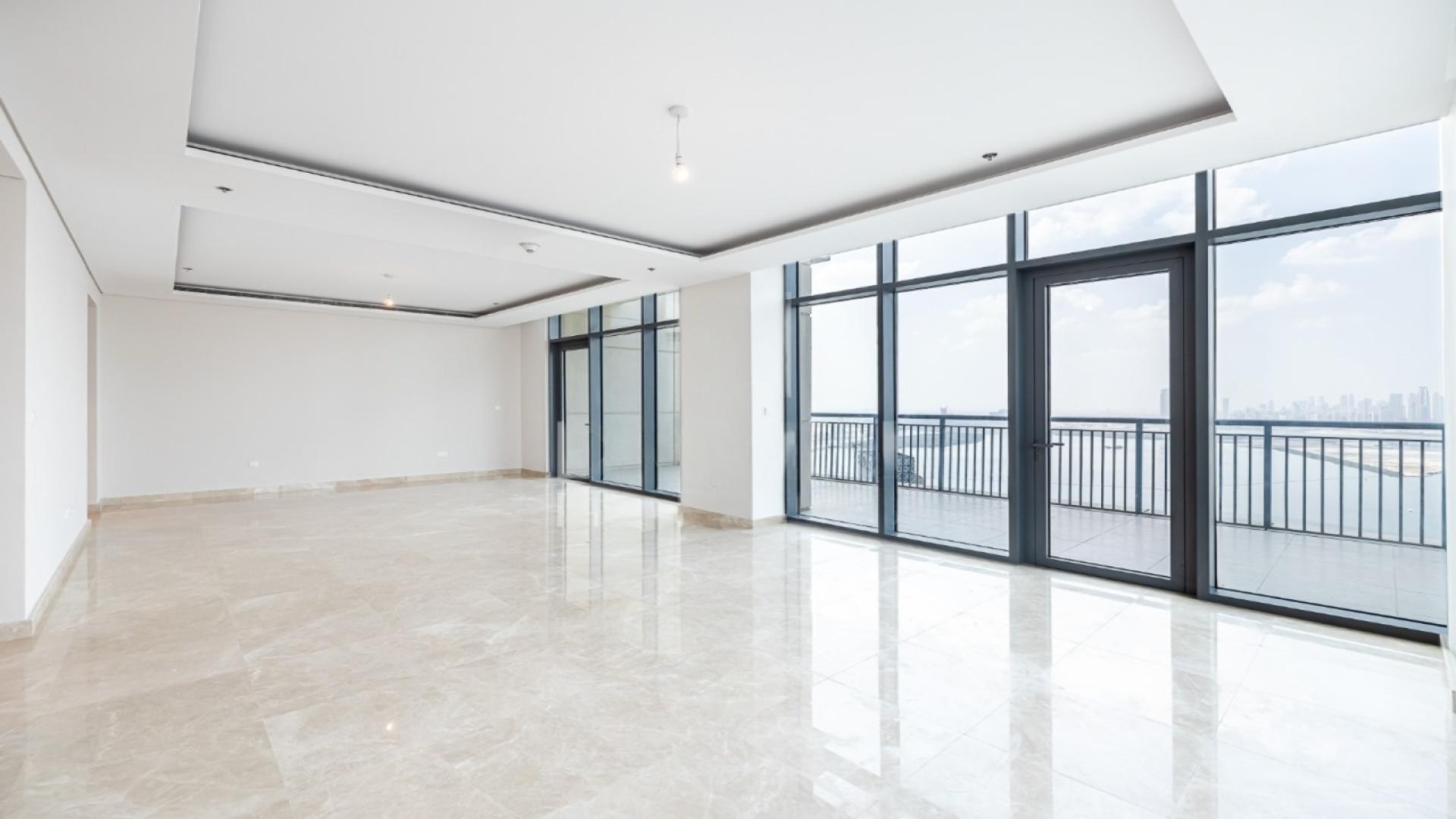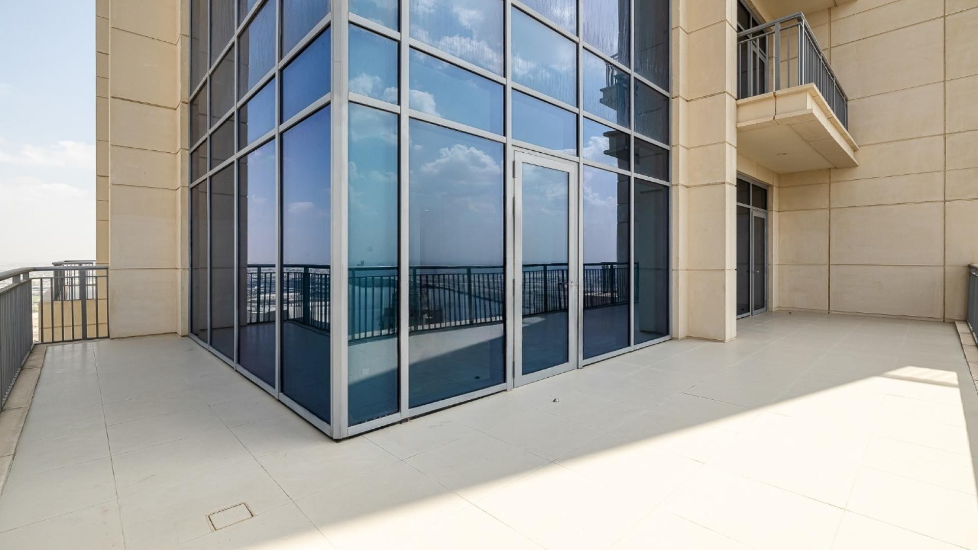The apartment includes three en-suite bedrooms with built-in wardrobes, a maid’s room, and a fully fitted open kitchen designed for modern living. Bathrooms feature premium finishes, while the unfurnished interior provides a clean, contemporary canvas.